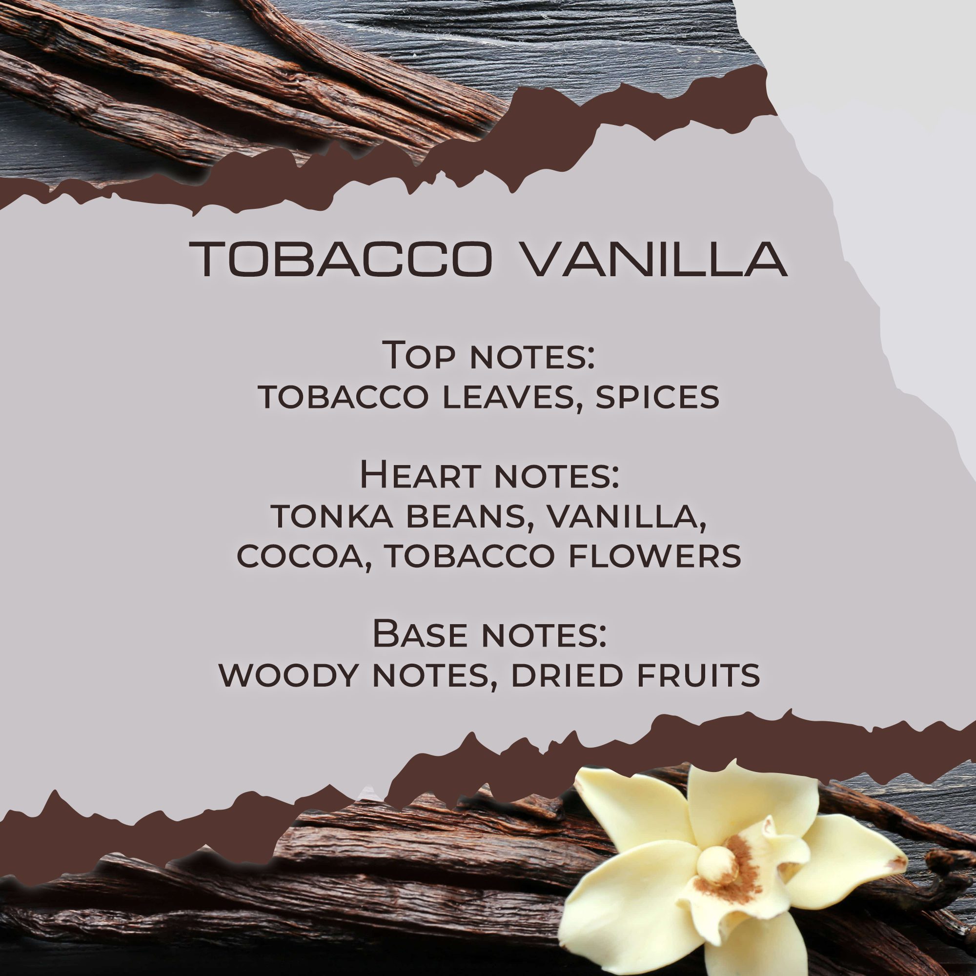 A fragrance of medium intensity. Notes of spices and tobacco leaves gradually unfold into a rich, delicate aroma of vanilla and cocoa. The trail manifests in translucent notes of woody bark and dried fruits. In an enclosed space, TOBACCO VANILLA spreads smoothly, with the peak of the aroma being most pronounced in the first minutes of entering the room.